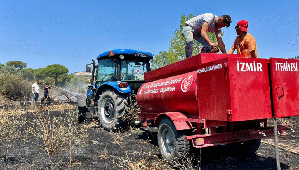 Bergama’ya bağlı Yukarıbey ve Hacıhamzalar mahalleleri yakınlarında başlayan yangın, kısa sürede büyüyerek ormanlık alana sıçradı. İzmir Büyükşehir Belediyesi İtfaiye Dairesi Başkanlığı ve İzmir Orman Bölge Müdürlüğü ekipleri, yangına hem karadan hem havadan hızlı bir şekilde müdahale etti.