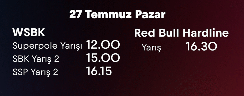 Pazar günkü program, saat 12.00’de koşulacak Superpole yarışıyla başlayacak. Ardından saat 15.00’te sezonun en kritik etaplarından biri olan ikinci ana yarış ekranlara gelecek. WSBK’nin en büyük favorilerinden Toprak Razgatlıoğlu, hem seriyi lider götürmek hem de tarihi bir galibiyete imza atmak istiyor.