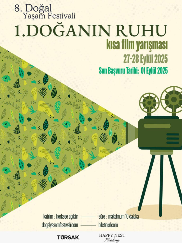 “Doğanın Ruhu” Kısa Film Yarışması Başlıyor: Sanatla Doğaya Yolculuk! Doğa-insan ilişkisini sinema aracılığıyla görünür kılmak amacıyla düzenlenen “Doğanın Ruhu” Kısa Film Yarışması, bu yıl ilk kez sinemaseverlerle buluşuyor. Türkiye Sinema ve Audiovisuel Kültür Vakfı (TÜRSAK) ile Happy Nest Healing iş birliğinde gerçekleşecek yarışma, 8. Doğal Yaşam Festivali kapsamında hayata geçirilecek.