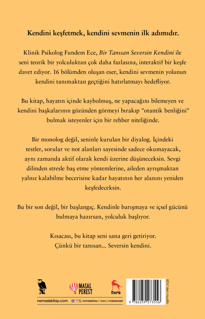 Fundem Ece’den “Bir Tanısan Seversin Kendini” Raflarda, Kendini tanımak… Belki de hayatın en zor ama en dönüştürücü yolculuğu. Uzman Klinik Psikolog Fundem Ece, yeni kitabı Bir Tanısan Seversin Kendini ile okurları tam da bu yolculuğa davet ediyor. Yazar, terapi odasındaki yıllara dayanan deneyiminden yola çıkarak, okurun hayatına dokunan, düşündüren ve harekete geçiren interaktif bir rehber sunuyor.