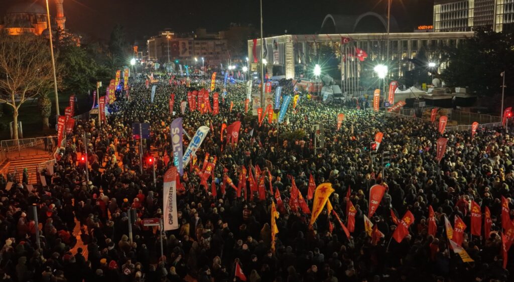 “Bir büyük acının yıldönümünde, bir büyük ayıbın yıldönümünde, bir muhteşem direnişin 365’nci gününde, bu soğukta, bu ayazda buraya geldiniz, burada beklediniz. Şimdi buradan hep beraber 111’nci yıldönümünde Çanakkale Zaferi’ni ve ‘Savaş kaçınılmaz değilse cinayettir’ diyen, hem tarihin gördüğü en büyük askeri, hem de tarihin gördüğü en büyük devlet ve barış adamını, Gazi Mustafa Kemal Atatürk’ü selamlıyoruz. Buradan Filistin’i, Bülent Ecevit’in Yaser Arafat’ı selamladığı gibi, Deniz Gezmiş ve arkadaşlarının mücadelesi gibi selamlarken buradan Amerikan emperyalizmine meydan okuyoruz. Kahrolsun Amerikan emperyalizmi. Hep beraber barış istiyoruz, kardeşlik istiyoruz ve yarınlara hep birlikte yürümek istiyoruz. Yeni bir dünya kuracağız, yağmurlarda yıkanıp güneşte kuruyacağız. Göklerle dost, yıldızlarla kardeş olacağız. Dökülürken dünyamıza ayın ışıkları, tutup kollarından bulutları hep beraber halaya duracağız. Tüm Türkiye’de bir söz veriyorum ve onu tekrarlamak istiyorum. Seçim olacak ya bir pazar er ya da geç bir pazar, o pazar günü o seçimi kazanacağız. O pazar günü partimizi iktidar, Ekrem Başkan’ı Cumhurbaşkanı yapacağız. O pazartesi günü akşam yeniden Saraçhane’de toplanacağız ve Bozdoğan Kemeri’nin önünde öğrencisiyle, polisiyle, işçisiyle, emekçisiyle, emeklisiyle, esnafıyla, eşrafıyla, omuz omuza halaya duracağız. Var mısınız? Var mısınız? Var mısınız? Şunu bilelim. Öğrenci kurtulmadan polis kurtulmaz. Tutsak kurtulmadan infaz koruma memuru kurtulmaz. Emekli kurtulmadan emekçi kurtulmaz. Köylü kurtulmadan esnaf kurtulmaz. Kurtuluş yok tek başına ya hep beraber ya hiçbirimiz.”
